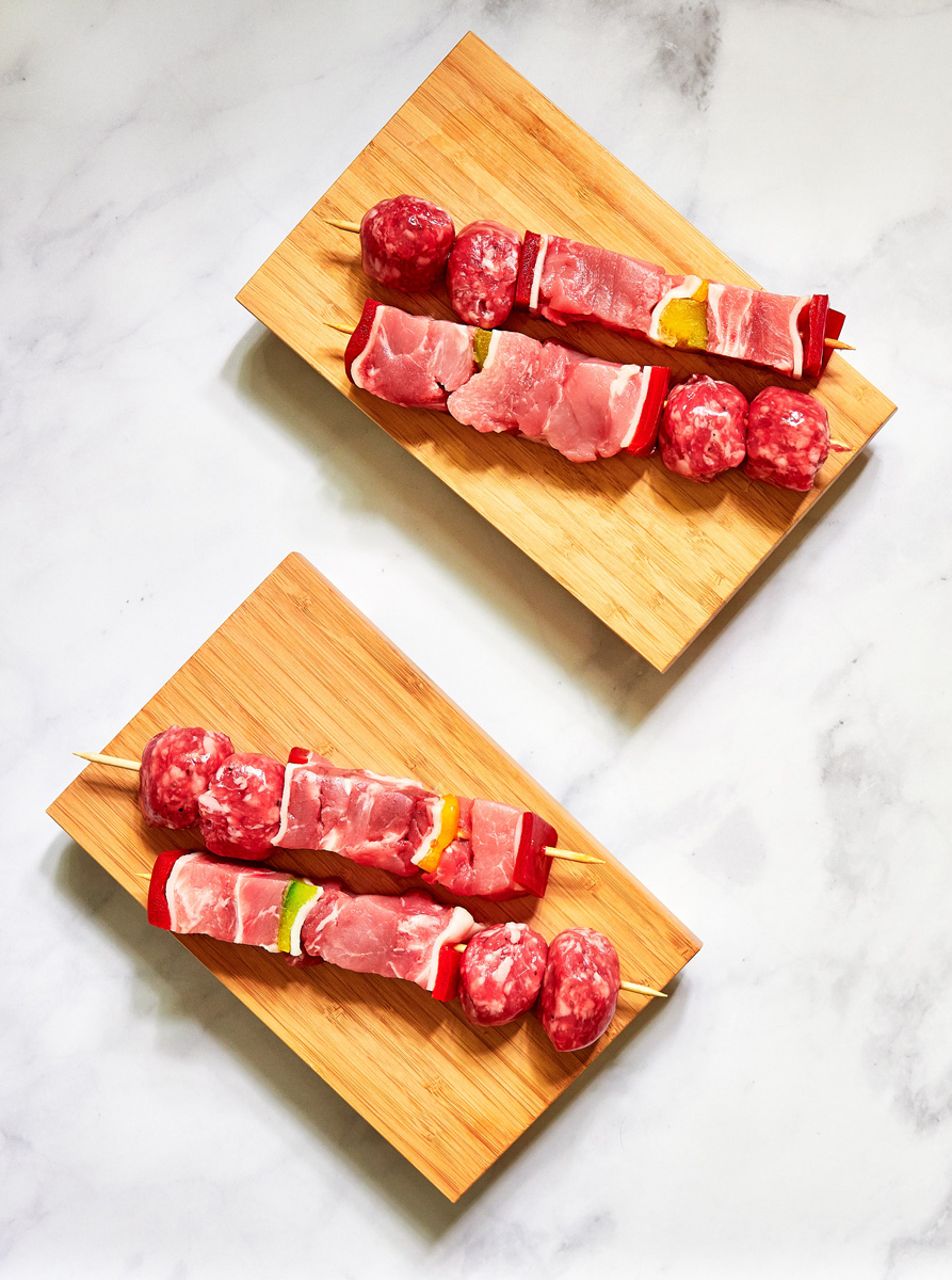 Brochettes composées de viande de bœuf et de porc accompagnées de poivrons rouges, jaunes et verts. Une composition qui épatera tous vos convives lors des barbecues.